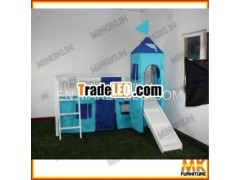 pine playtime bed with castle door, slide, slats, tunnel, tent.